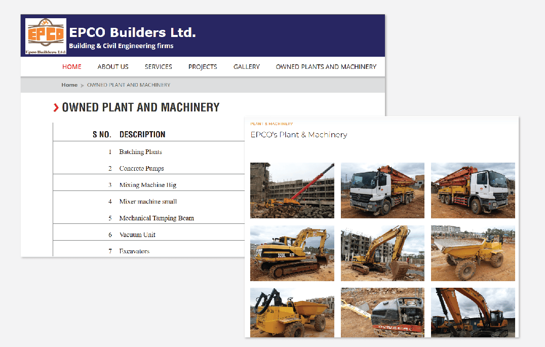 EPCO Builders, one of the largest firms in Kenya, prominently showcases its plant and machinery online, reinforcing its industry dominance.